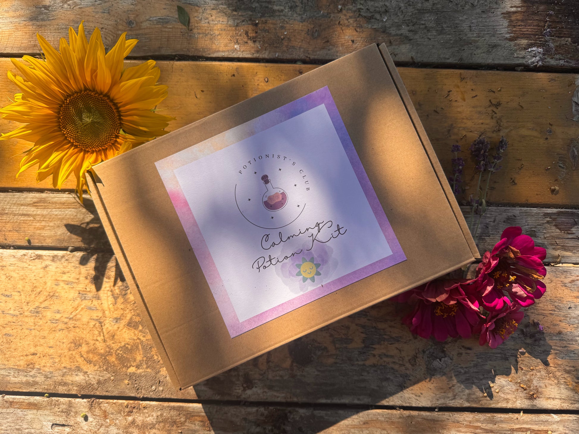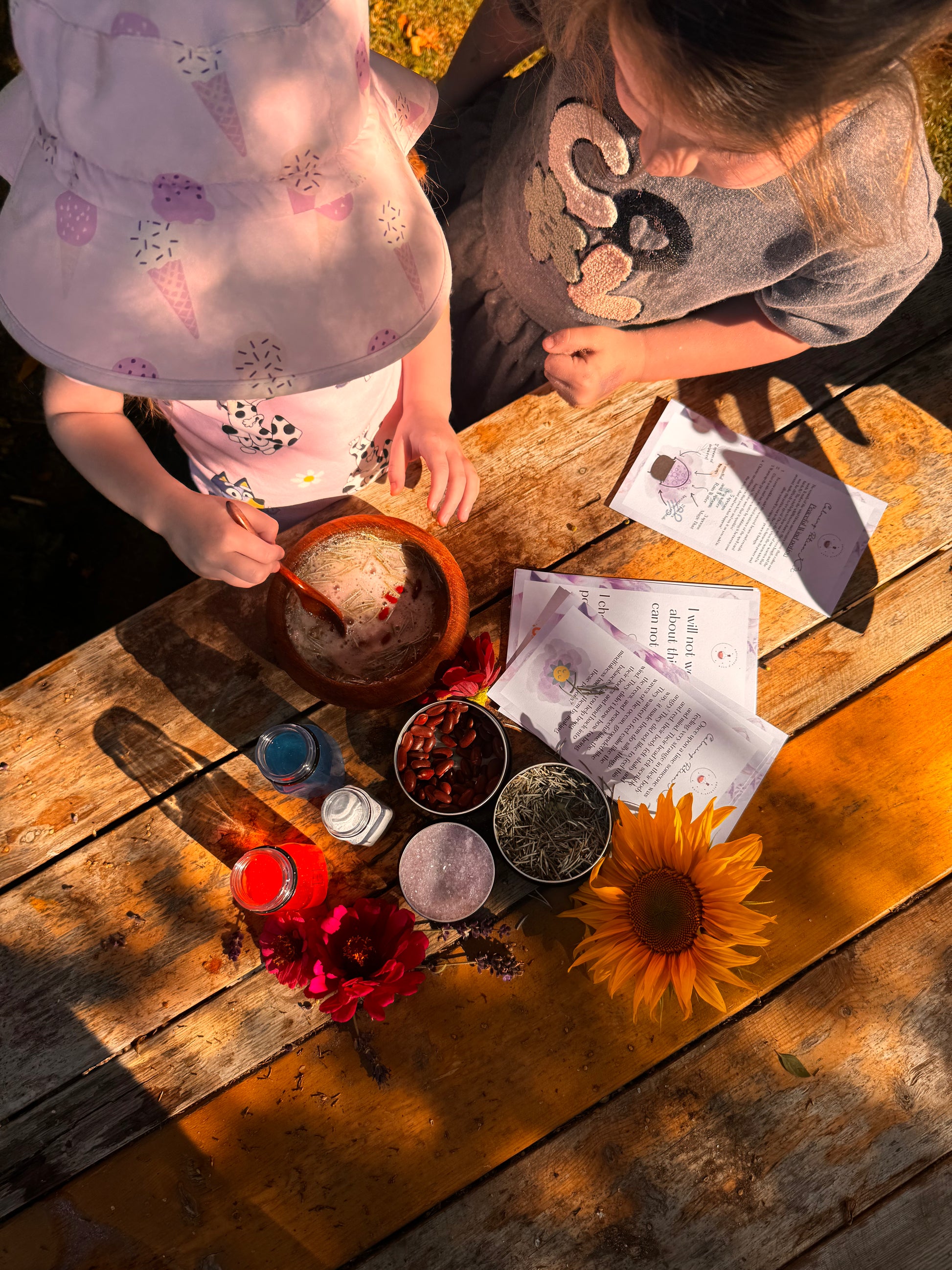 Each kit comes with all the ingredients to make the potions, a wooden spoon, spell card, affirmation cards and a reflection card.